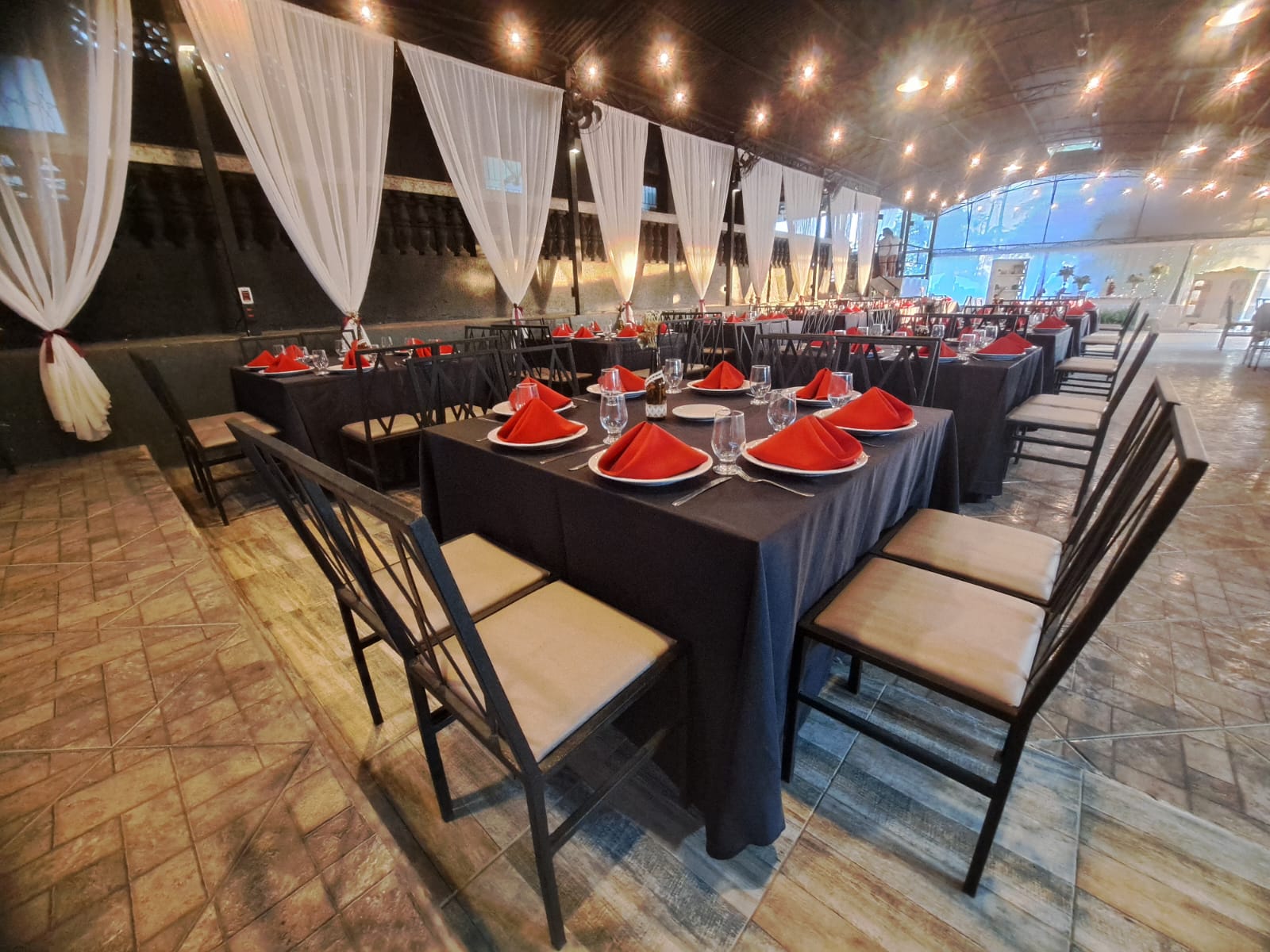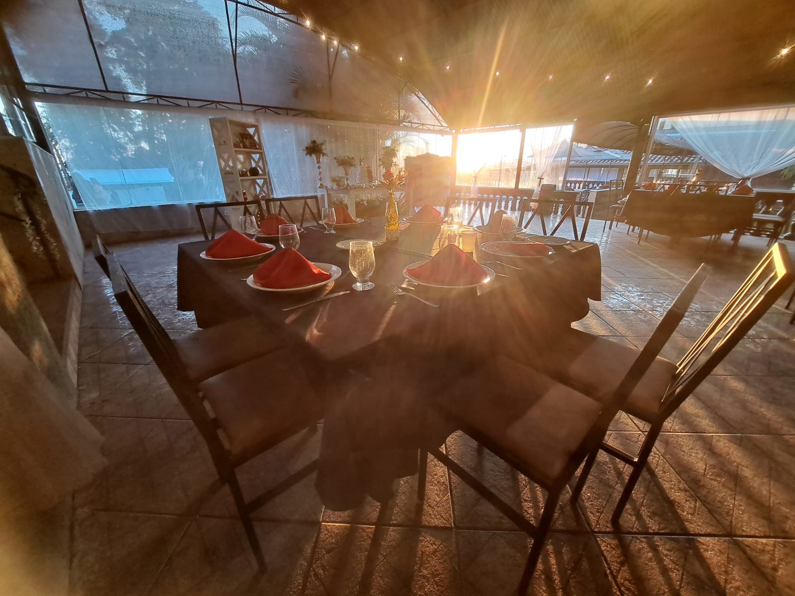 Mesas de granito, cadeiras de ferro forjado e toalhas exclusivas — clima sofisticado já incluso.